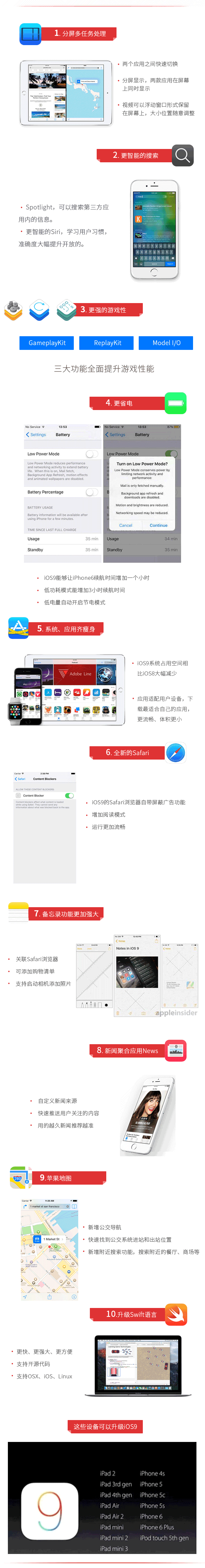 北京时间9月17日凌晨,苹果正式向普通用户推送了iOS9正式版的更新,iOS8.4.1用户现在打开更新可以直接OTA升级到iOS9。iOS9已经内测+公测3个多月,目前基本已经非常完善,非越狱用户升级没有问题。那么iOS9都更新了什么呢?有哪些值得更新的点?哪些设备支持iOS9呢?IT之家【一图知】让你一目了然。