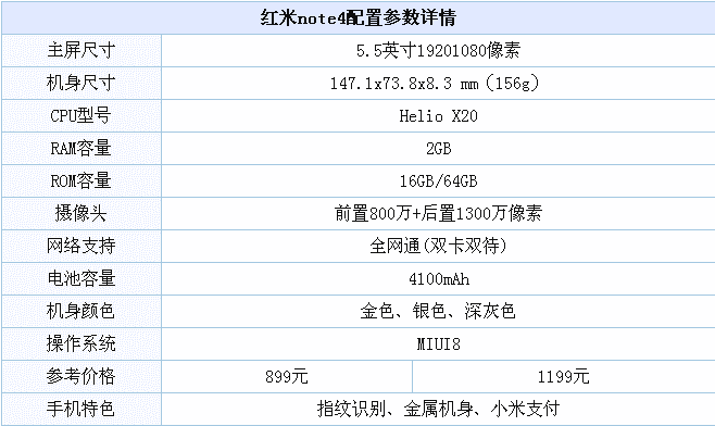 红米Note 4采用全金属机身,预计配备5.5寸1080p屏幕、联发科Helio X20十核处理器、2/3GB内存。