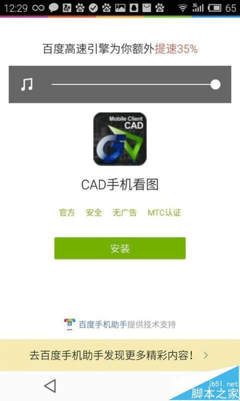 2、我们挑选下载量最高的,百度评分最高的手机CAD软件下载,点击下载,会提示你安装百度手机助手,我们点确定,百度手机助手安装完毕后就会下载 手机看图CAD,