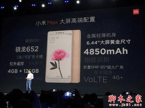 小米Max搭载骁龙650/652处理器,内置3GB/4GB RAM+32GB/64GB/128GB ROM,后置1600万像素相位对焦相机,支持VoLTE、红外遥控和指纹识别。