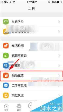 1)打开二手车之家,点击下方的【工具】,接着点击【加油充值】;(如下图)