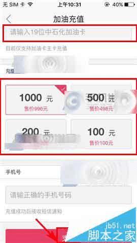 2)点击编辑框输入油卡卡号,接着点击选择充值金额,最后点击【支付】即可。(如下图)