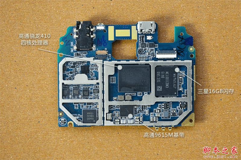 这一面的屏蔽罩都可以打开,除了熟悉的高通骁龙410处理器和9615M基带,同样来自大厂出品的还有三星闪存,容量16GB。