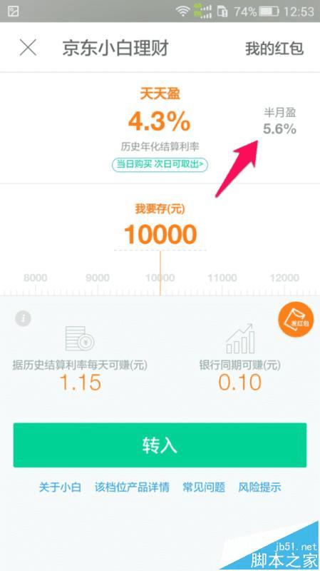 4、我们在京东金融app中向左滑可以选择京东小白理财半月盈,历史年化收益有5.6%,和半年盈是一样的收益,小编还是比较推荐这个的。选好以后我们点击下方的转入。