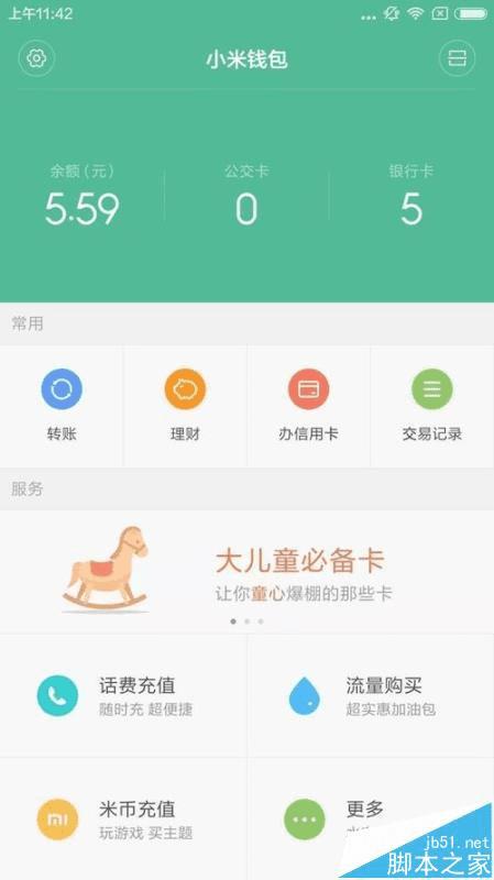1、首先,我们用自己的小米手机升级更新到最新MIUI系统,然后,我们再打开手机桌面上的小米钱包图标,进入后我们这里找到且点击公交卡。