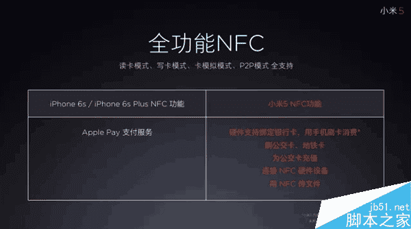 小米5配备了全功能NFC,拥有读卡、写卡、卡模拟以及P2P模式,也就是可以绑定银行卡消费、刷公交地铁、充值、NFC互联传输等。