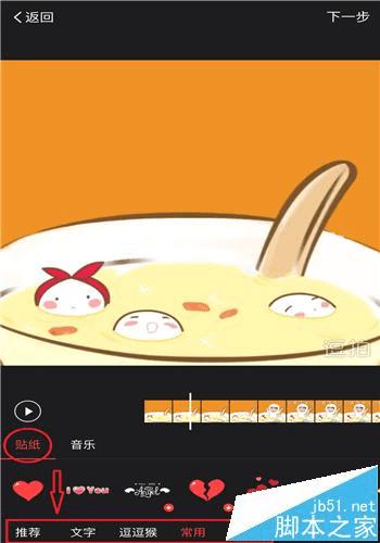 5、接下来就到此界面(如图),里面有多种贴纸可添加,也可以加文字等等。完成后点击右上角的下一步。