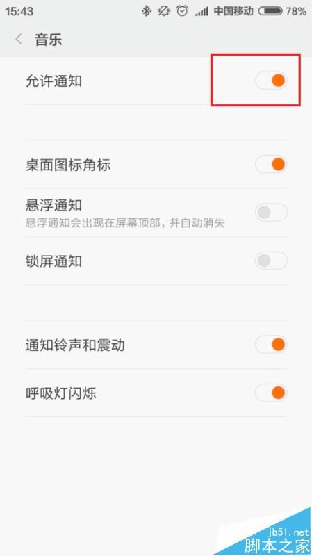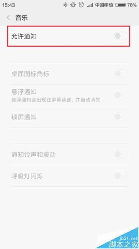 4、接下来,在打开的页面中,我们可以看到小米音乐应用通知处于允许通知状态,我们需要点击该按钮开关,将其允许通知的功能按钮关闭。