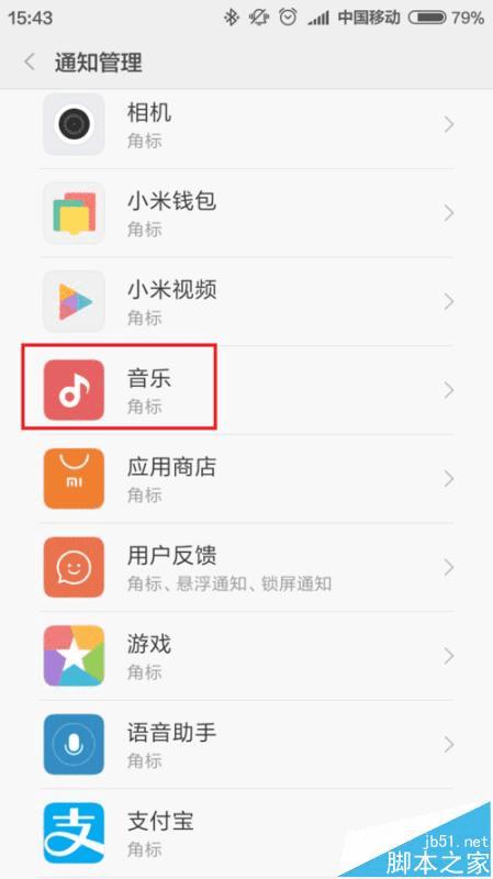 3、接下来,我们就需要在手机中安装的一系列应用中找到“音乐”应用,然后进入音乐应用的通知管理设置页面。