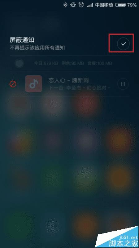 5、接下来,在页面右上方弹出的“确认屏蔽”按钮中,点击选择该按钮,然后我们就可以确定屏蔽了小米音乐的通知栏控制开关了,同时我们也可以看到应用被屏蔽的记录提示。