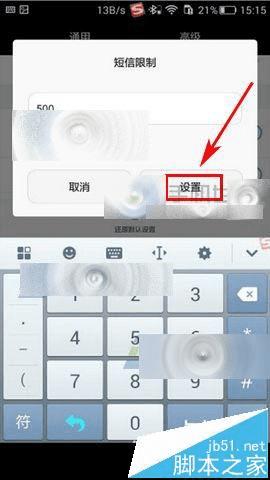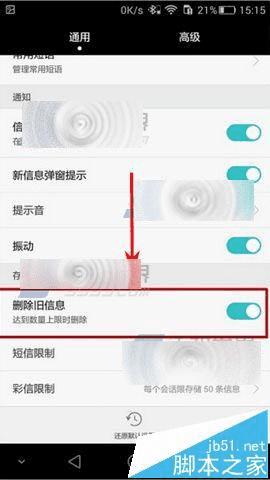 2)接着再把【删除旧短信】那栏椭圆往右拉打开,最后点击【短信限制】设置条数,满了就会自动删的了。(如下图)