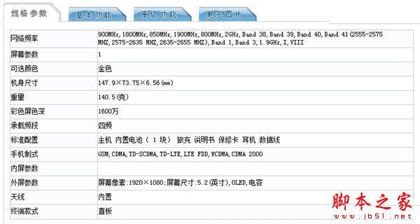 此外,该机还拥有4GB内存和64GB机身存储空间,800万前置+1300万像素主摄像头,支持双卡双待全网通,电池容量为2400mAh,运行Android 5.1.1系统。
