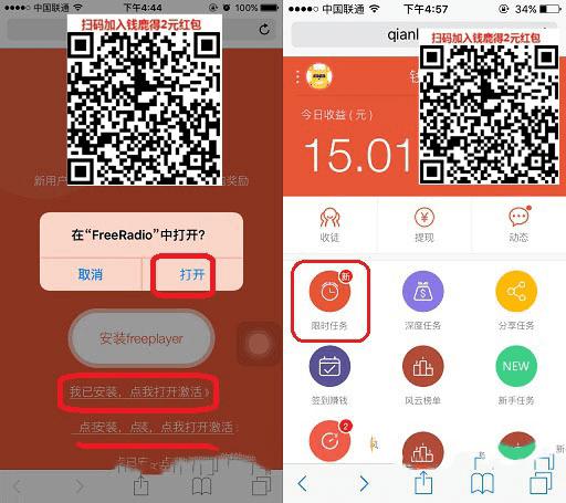 5.下载安装成功之后打开软件,再点击“我已安装,点我打开激活”,在选择打开,接着就可以在限时任务里抢任务赚钱了,如图: