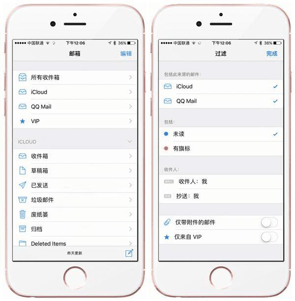 邮件在12.9英寸版iPad Pro上可显示为三列,它会自动预测你的邮件分类并在你选择时给出建议,邮箱左下角提供了新的过滤器,可以列出所有带附件的邮件、VIP邮件、未读邮件等等。