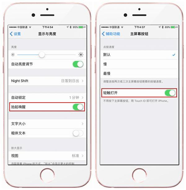 iPhone6s、iPhone6s Plus、iPhone SE等搭载A9处理的机型解锁体验无疑最为完美,开启“抬腕唤醒”后直接拿起手机就会自动亮屏,连键都不需要按,看时间通知非常方便。同时开启“轻触打开”的话,把手指放在Home键上拿起手机即可亮屏并解锁,体验出色,强烈推荐二者搭配使用。