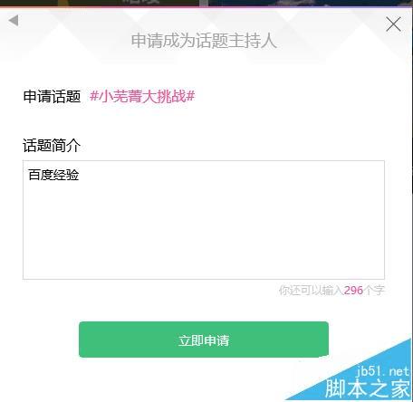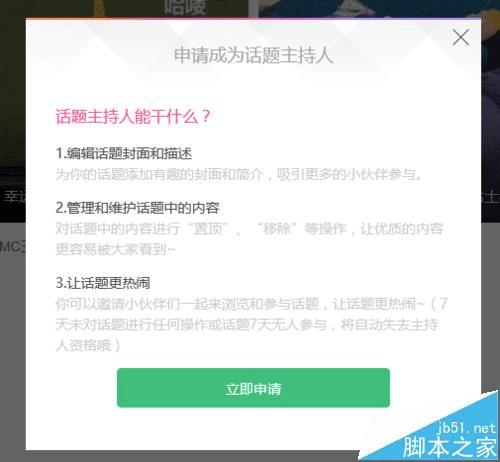 5、进入后右上角会出现[申请主持人],看到后点击[图片与话题不对原因:之前的话题已经申请了]