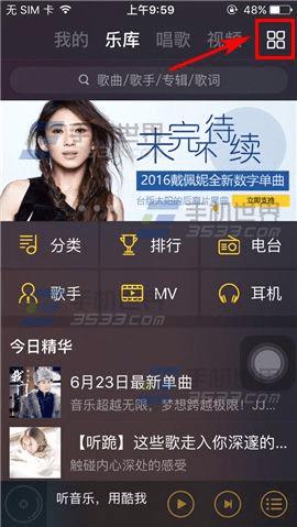 1)打开酷我音乐,点击右上角的【按钮】,接着点击【换肤】;(如下图)