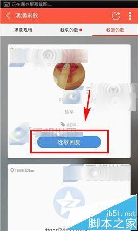 3)在求歌现场当然还可以抢单回歌啦!不想要回的求歌就【向上拨动】,找到你要回的点击【抢单】,接着点击【选择回复】。(如下图)