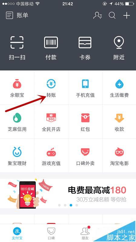 5、来到支付宝的首页,点击转账。