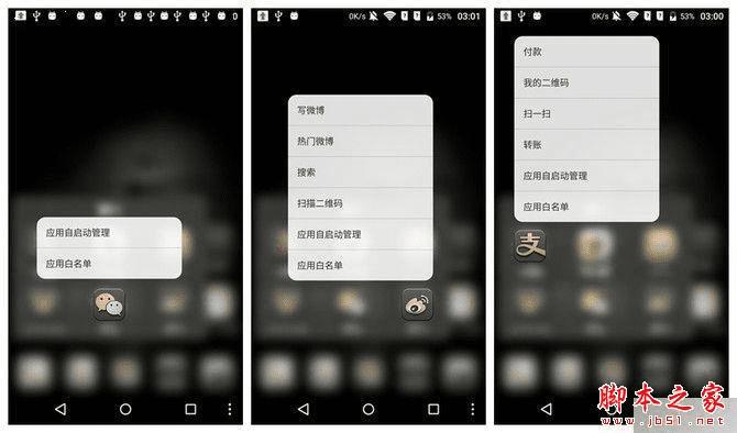 ▲微信、微博、支付宝快捷菜单
