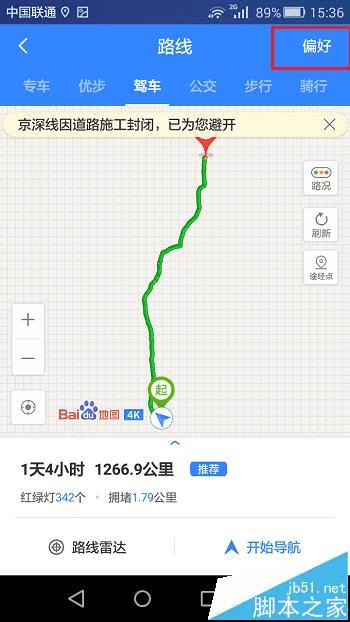 3、百度地图迅速会出现一条路线,用时多少,路费多少,我们点击右上方的偏好,如下图所示: