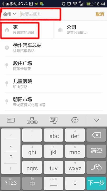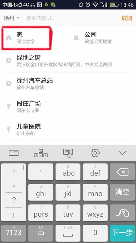 2、选择下面的出发地点和目的地,其中我们可以看到一个“家”没有添加家庭地址所以是空的,如下图所示