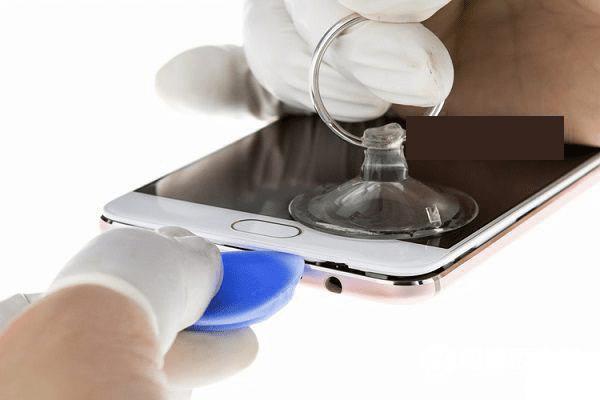 4、OPPO R9后盖通过螺丝与卡扣固定,在第三步拆卸完固定螺丝后,需要借助吸盘、翘棒从屏幕面开始拆机。具体操作方法是:使用吸盘吸起屏幕一角,用力吸开一条缝,同时,借助翘片,将屏幕分离开来,如图所示。