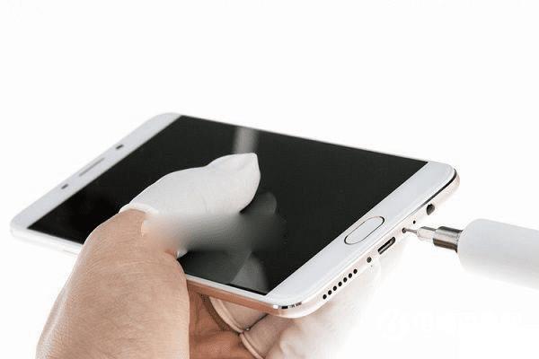 3、使用梅花螺丝刀将OPPO R9机身底部的2颗固定螺丝拆卸下来,如图所示。