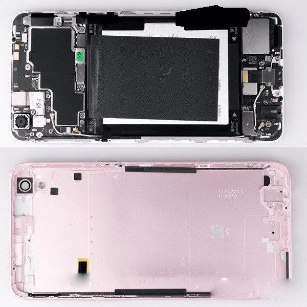 打开后盖后,就可以看到OPPO R9的内部结构了,该机采用了常见的三段式内部设计,上下两段为主板,中间大面积区域为电池。其中上面大主板和电池上均覆盖有石墨散热层,说明这款手机对散热比较注重,做工方面还是非常工整扎实的。