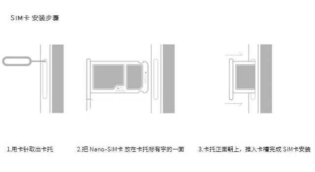 2.把 Nano-SIM卡 装入卡托标有字一面的卡槽1,如果是双卡用户,还需要使用一张Micro SIM卡或Micro TF存储扩展卡装入卡槽2位置。
