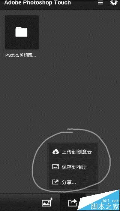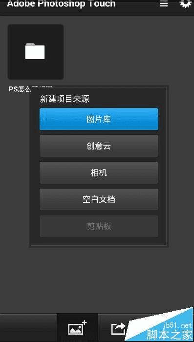 1、进入Photoshop Touch,首先,像如图所示添加我们想要处理的图片,可以添加图片库、创意云等里面的图片