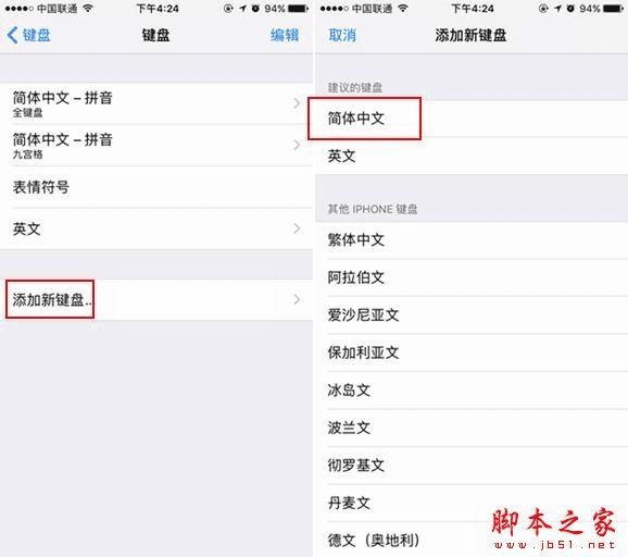 3、接下来进入的键盘页面设置中,依次再次点击【添加新键盘】---选择【简体中文】,如图所示: