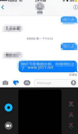 iOS10短信新功能介绍:首先我们进入iMessage找到一个人进行聊天,点击输入框我们看到左边有一个箭头图标,点它就会出现三个图标,分别是:相机、心和应用商店。相机我们就不用说了,就是视频,重点是后两个。