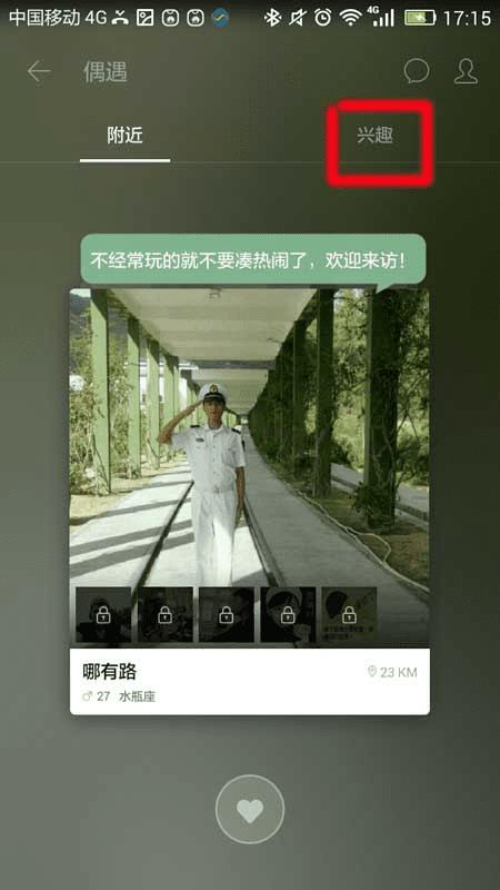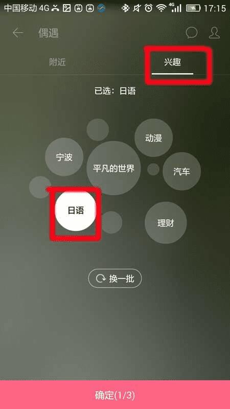 3、进入“偶遇”以后有两个选项,分别是“附近”和“兴趣”,点击兴趣,找到感兴趣的项目,没有的话选择换一批知道找到自己喜欢的为止,然后点击“确定”,如下图所示。