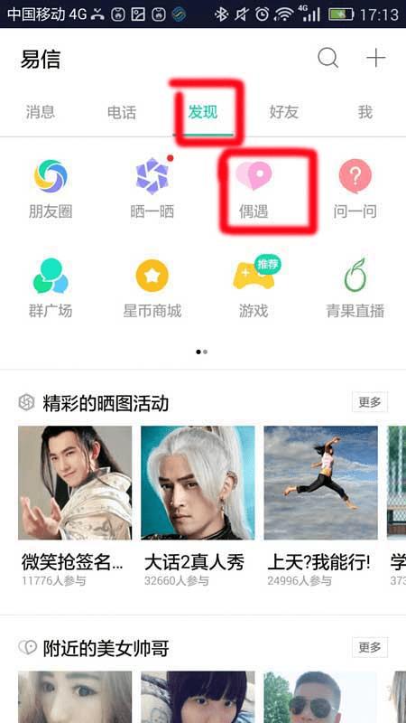 2、进入以后可以在上面看到“发现”选项,点击进入,找到“偶遇”选项,如下图所示。