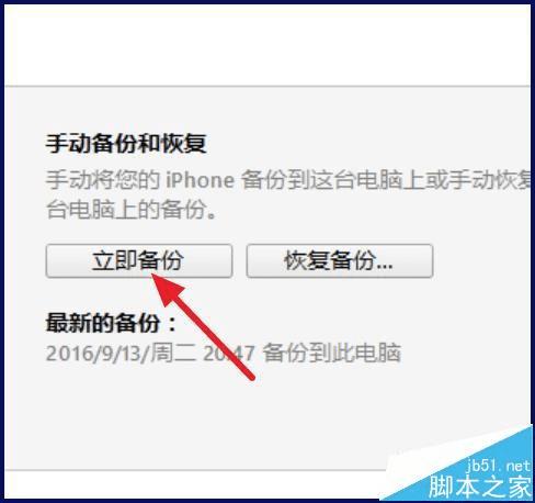 5、进入iPhone的【摘要】界面,点击手动备份和恢复下的【立即备份】