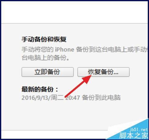 7、如果不小心跳过这个页面,也可以在手动备份和恢复下的【恢复备份】