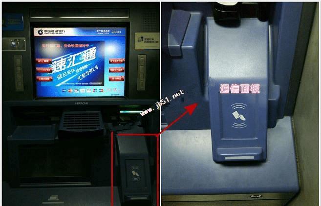 第三步:进入建行自主取款区域后,在取款机右下角可以看到有一个通信面板,这里就是NFC感应区,将小米5/5s背面的NFC区域靠近或者放置在这里,如下图所示。