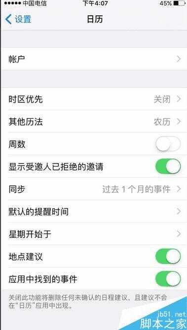 使用苹果手机开启计算日历中的周数的方法 来源:www.45fan.com 2016-11-16 15:11:12 使用苹果手机开启计算日历中的周数的方法 苹果手机日历是默认没有周数的。 点击苹果手机的设置,进入到设置界面。 找到设置种的日历,点击进入到日历界面。 日历界面第四行有个周数。 将周数键往右滑动开启,这样就开启了周数了。 这样开启后,日历前面就会显示周数了。 推荐阅读 iOS10.2 Beta7固件下载苹果地址有哪些? iphone7plus双摄像头无法使用的解决方法 iOS10.2刷机的方法 微信视频可以开启美颜吗? 苹果发布iOS 10.2第六个测试版的详细介绍 如何下载ios10.2 beta6固件? 将苹果iphone投屏到电视上的步骤 苹果iOS10.2正式版固件更新修复内容有什 使用iPhone7连接电脑的步骤 苹果iPhone7亮蓝色的真机评测