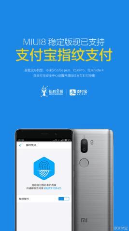 新上市的小米5s/5s Plus,以及用小米5、红米Pro、红米Note 4的朋友们,升级到最新的MIUI 8后,就可以在支付宝安全中心设置开通指纹支付