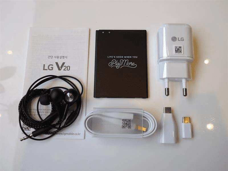 打开所有配件,除了常规的耳机、数据线、电源适配器之外,还有一个OTG转接器和Type-C转microUSB的转接器,LG在配件上似乎也看齐了三星。由于V20采用可换电池的设计,包装内当然还有一块专用电池。