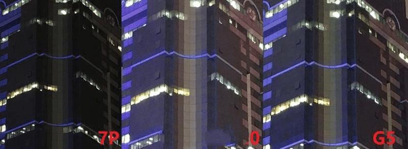 从这一组样张来看,曝光方面,LG两台手机相比iPhone 7 Plus都要大很多,在灯光处很多都出现过曝的情况,儿其中V20比G5在曝光控制上要更加激进一些,有一种把黑夜拍成白天的感觉。
