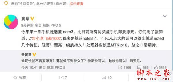 自去年魅族PRO5发布以来,魅族已经有很长一段时间没有新机出现了,而根据此前的种种曝光我们一直以为魅族2016年首款新机会是PRO6,而今天黄章在微博上明确表示了今年第一部手机会是魅蓝note3。