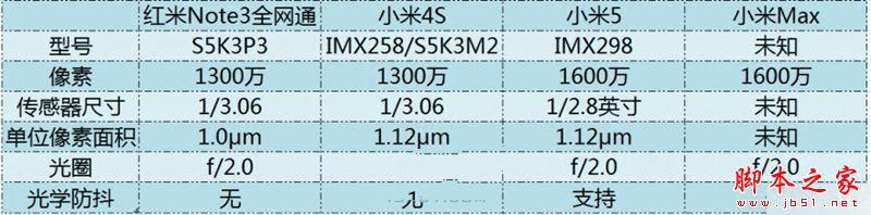 小米Max/小米5/红米Note3/小米4S相机参数对比,如下所示: