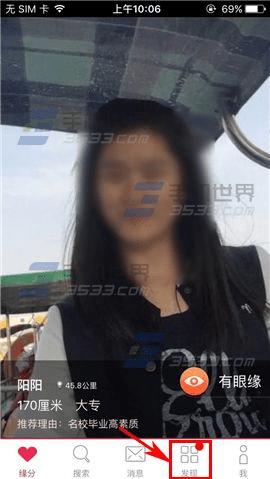 1)打开世纪佳缘,点击下方的【发现】,接着点击【缘分圈】;(如下图)