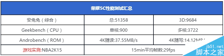 而游戏实测方面,15min NBA2K15的平均帧数为29fps,但游戏当中偶尔会存在卡顿。当然游戏的特效也是默认没有修改过的。发热方面,游戏实测后荣耀5C机身后壳金属部分略微暖手,整体来说发热控制得不错。麒麟650可以说在中端Soc阵营已经表现得相当不错,可能唯一的悬念就在其基带是否支持电信了。