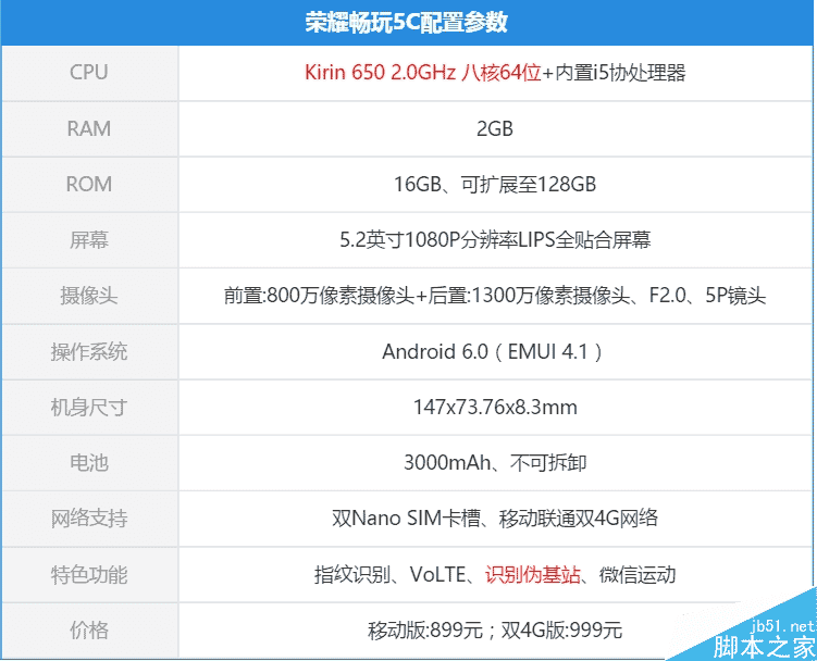 其它方面,配备了2GB RAM 16GB ROM的内存组合,采用5.2英寸1080P分辨率屏幕,前置800万像素摄像头 后置1300W像素摄像头,内置3000mAh容量电池,双卡双待,运行Andorid 6.0版本的系统。