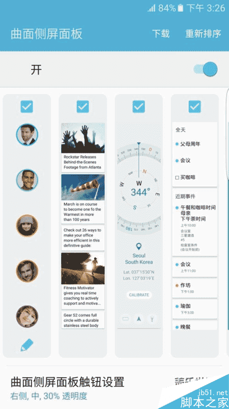 除此之外,侧面屏的功能也更加强大,支持尺子、指南针、手电筒等快捷工具,可查看日程、天气、备忘录等等,总之S7 edge的侧面屏功能变得非常丰富而强大。