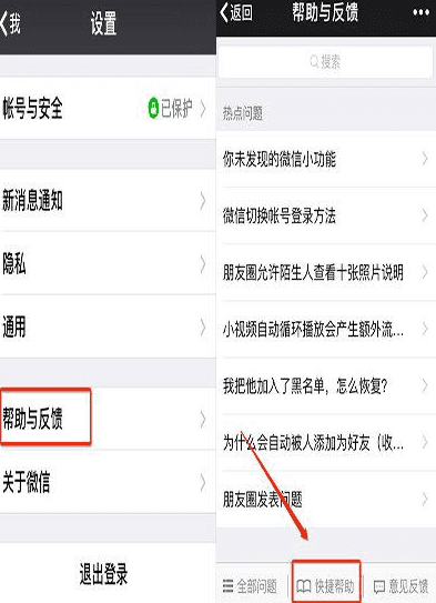 2、从微信的「设置-帮助与反馈 - 快捷帮助 - 异常修复」进入故障修复功能;
