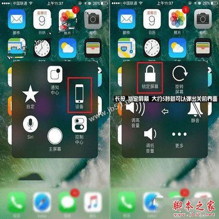 2、开启iPhone7小白点功能之后,点击屏幕上小白点,在弹出的操作中,点击「设备」,然后再按赘锁定屏幕」不放,大约5秒钟后,同样会弹出iPhone 7滑动来关机界面,之后按照提示滑动屏幕关机即可,如下图所示: